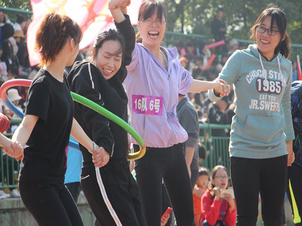 第三项比赛是“快乐传递”,教职工们站成一排手拉手,将呼啦圈由队首第一人传至最后一人,用时最短者胜出。他们的手相互紧握,照准角度,相互配合,让呼啦圈在紧张的氛围中不失秩序地传送至下一个人,将呼啦圈灵活玩转。最后一项比赛是“团结杯”接力赛,30位队员接力,往返跑100m后,将手中的接力棒传递给下一个人,用时最短的队伍获胜。一声枪响,教职工们就如同离弦的箭快速向前跑去,使尽浑身解数去冲刺,在赛场上展现了自己的飒爽英姿,诠释着运动的魅力。