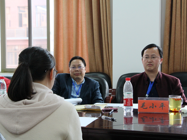 在立言楼B417的学科语文(非全日制)面试教室里,考生罗萍姣因紧张,自我介绍断断续续,院长刘奇玉笑着对她说道:“没关系啊,不要紧张,慢慢来,不急。”关切的眼神让她感到一些放松,长舒了一口气害羞地笑了笑,开始了流畅地回答。老师们一些专业的提问,她也能回答出来。吴投文老师对她“如何训练听说读写方面”问题的回答表示赞许,他说“语文和生活是分不开的。”