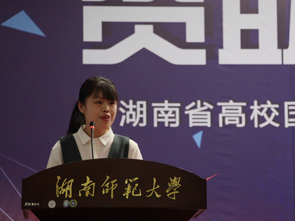 KY.COM15级汉语言专业吴玉容劈波斩浪经过层层选拔,成为首次报告会五位报告人之一,向在场的包括湖南中医药大学、湖南商学院、湖南财政经济学院、湖南第一师范学院、湖南涉外经济学院、长沙医学院、湖南师范大学在内的7所高校的老师、学生代表讲述自己的成长经历、奋斗历程。