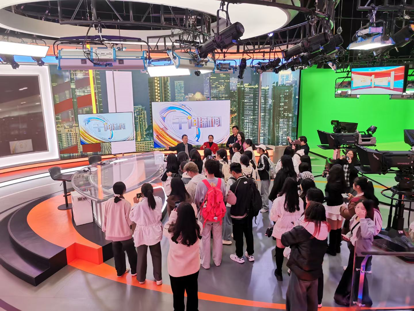 活动的最后一个环节,在工作人员的带领下,师生深入到长期承担午间和晚间新闻直播工作的直播间内部,参观体验科技感。在直播间中,高金华介绍了直播间中的设备,如:德国进口的灯光,超高清摄像机,绿幕虚拟背景模拟设备等。在参观过程中,高金华还详细介绍了湖南卫视“三起三落”的曲折发展,强调并分析了当前新闻行业正面临着新媒体的冲击,而作为新闻从业者则要始终秉持“忠诚担当有情怀,勤奋能干有内涵”的宗旨。同学们亲眼目睹了先进的直播设备,并现场体验了沉浸式的直播场景,直观感受到湖南卫视充满科技感和文化氛围的新闻工作环境。这一体验极大地激发了大家对新闻学习的热情,也让他们对未来职业规划更加明确。
