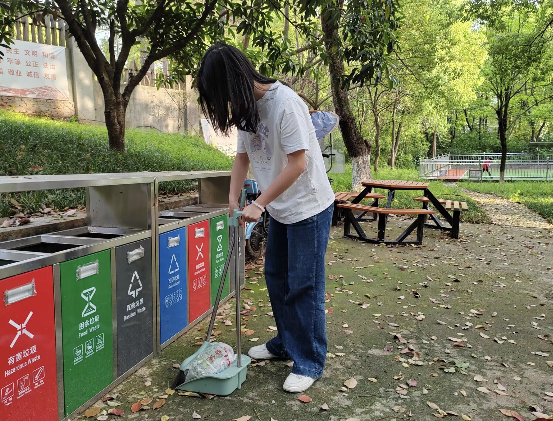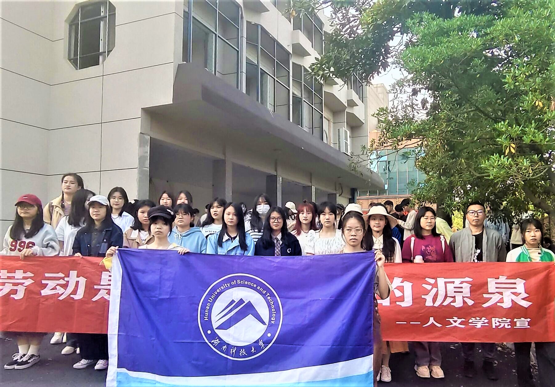 当天下午四点半,同学们准时带着扫把、簸箕、垃圾袋等工具到达各班集合点,并迅速前往卫生区域。他们清理地面上的垃圾和路边的纸屑,并轻声提醒游客在欣赏樱花盛开的美景的同时,注意保持卫生。经过一个多小时的努力,各班负责的区域都得以清扫干净,清扫后的垃圾被扔进了附近的垃圾桶。最后,同学们手举院旗,在写有“劳动是一切知识的源泉”的横幅下合影留念,庆祝此次劳动教育户外实践课程圆满完成。