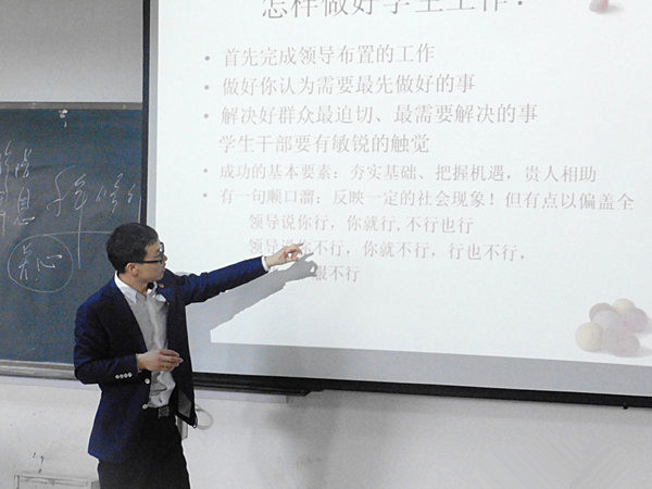 “KY.COM的学生都很有气质,女生漂亮,男生帅气,我是很愿意来KY.COM演讲的。”尹风雨甫一开口,引得笑声一片。他就“如何做一名优秀的学生干部”这一主题进行演说,指出共青团的职能是组织、引导、服务青年,维护青少年权益,并用歌曲《白狐》的歌词“千年修行”这一句来鼓励学生干部们在大学要不断提升自己,像“修行”一样去学习。当谈到当好学生干部的要求和应具备的基本素质时,他更是结合自己当年任学生会主席的经历,分享学生工作的快乐之处。尹风雨多次强调自信的重要性,并笑称“觉得自己很有魅力”、“帅呆了”。