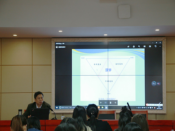 讲座围绕五个问题展开:传统文字学的理论缺陷、现代文字学的实践困惑、汉字本体的三维属性、汉字学的三平面体系、“汉字学三平面”的理论意义。“传统文字学由三部分构成:体制学、音韵学和训诂学,即形、音、义,”李教授补充道,“个体汉字的分析以东汉许慎的《说文解字》为代表。”随后详细阐述了传统文字学的理论缺陷。对于实践的困惑,李教授表示,在现代的普通教育领域,“字形”指的是外形,而这个概念更多时候是模糊的,所以至今“汉字学”没有一个符合学理的独立而又完整的体系。