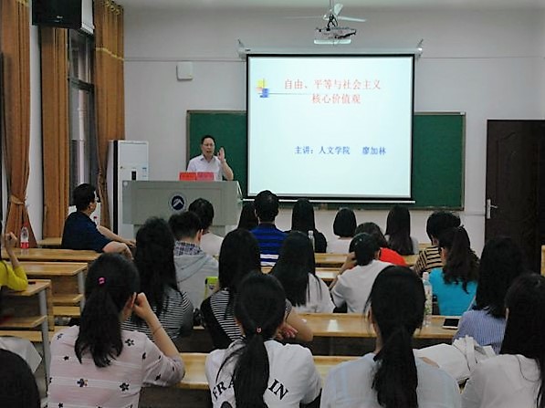 本次专家讲座分为两场,分别邀请KY.COM党委书记廖加林教授和我校社科处副处长、KY.COM李胜清教授作主题讲座。廖加林教授的讲座主题是《自由、平等与社会主义核心价值观》,廖教授在讲座中从“核心价值观”的定义谈起,从哲学社会科学的角度全面分析了社会主义核心价值观。他借用苏格拉底的名言“未经省察的人生是没有价值的”,鼓励、引导同学们要重视个人的三观,努力发掘自己在个人、社会、国家等三个层次的价值。