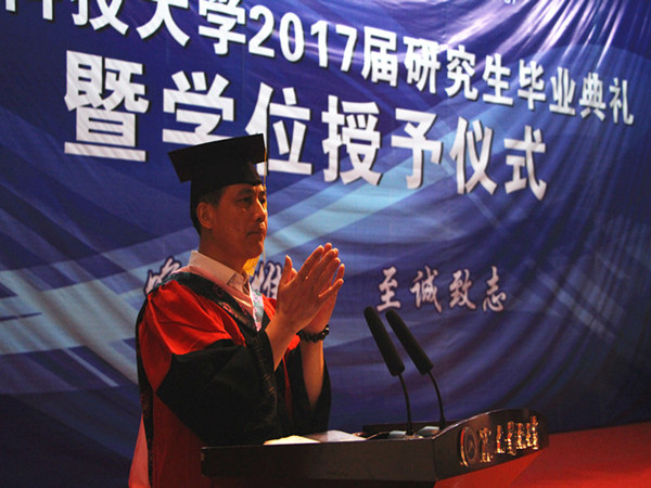 此后,我院吴广平教授作为研究生导师代表上台发言,作题为《独立· 坚持·爱》的主题演讲,对毕业学生顺利毕业表示祝贺。“日月不淹,春秋代序。三年读研时间,转眼而过,你们在科大留下了最青春、最美好、最浪漫、最珍贵的记忆,你如果离开湖南,可能会认为湘潭真是红太阳升起的地方,离别在即,语已多,情未了,以上谈的无非是做老师的对即将离校的同学们的几句老生常谈,是一个老男人的碎碎念。衷心祝愿在座的每一位同学,奔赴祖国各地,母校和老师为你加油,为你骄傲!”吴广平说道并致以在座学生“独立、坚持和爱”这三个词作为临别赠言。