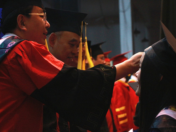 典礼在庄严的国歌声中拉开帷幕,我院领导老师及五十名毕业硕士研究生依次入场并在指定位置就座。校长李伯超致辞并宣布完学士学位授予决定后,按照流程顺序安排我院五十名毕业硕士研究生身穿深蓝色学位服,头戴着学位帽,帽上荣誉流苏轻垂,在工作人员的组织下,依次从主席台左侧入场,整齐地迈向主席台。依次来到主礼教授席前,向校长等其他领导老师鞠躬致谢并握手,主礼教授微笑地将各位毕业研究生帽子上的流苏从右侧拨到左侧,并向各学位获得者握手并授予硕士学位证书。