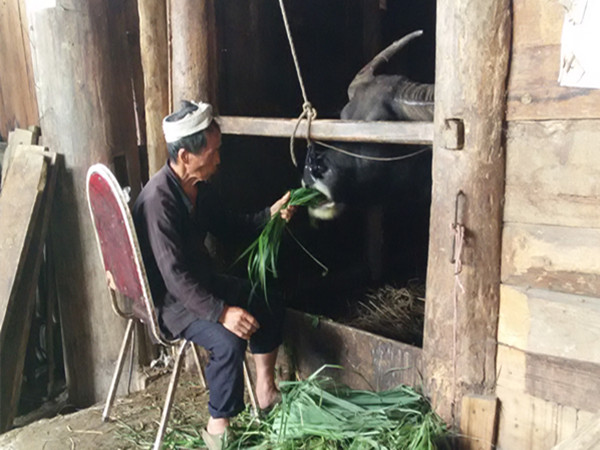 (岜扒斗牛饲养人在给村寨的斗牛喂食养料)