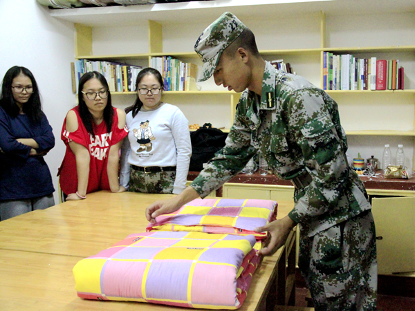 “教官中秋节快乐!”10月4日晚正是中秋夜,教官下寝中,处处能听到这样的声音。各排教官由助班带领进入新生宿舍,下寝的主要任务是教会新生怎么叠“豆腐块”被子。七排教官黎吟香一走进五区新生寝室,就受到大家的热烈欢迎。黎教官一边向大家示范怎么叠“豆腐块”,一边和大家聊着天,寝室充满了温馨随意的氛围。 另一边,五区二栋505新闻系寝室和508思政系寝室中人头攒动,两位教官叫来各寝室长观看如何叠被子,吸引了大量新生前来观看。新生在聊天中得知教官也是来自学校各学院的学长学姐,更是拉近了双方间的距离。