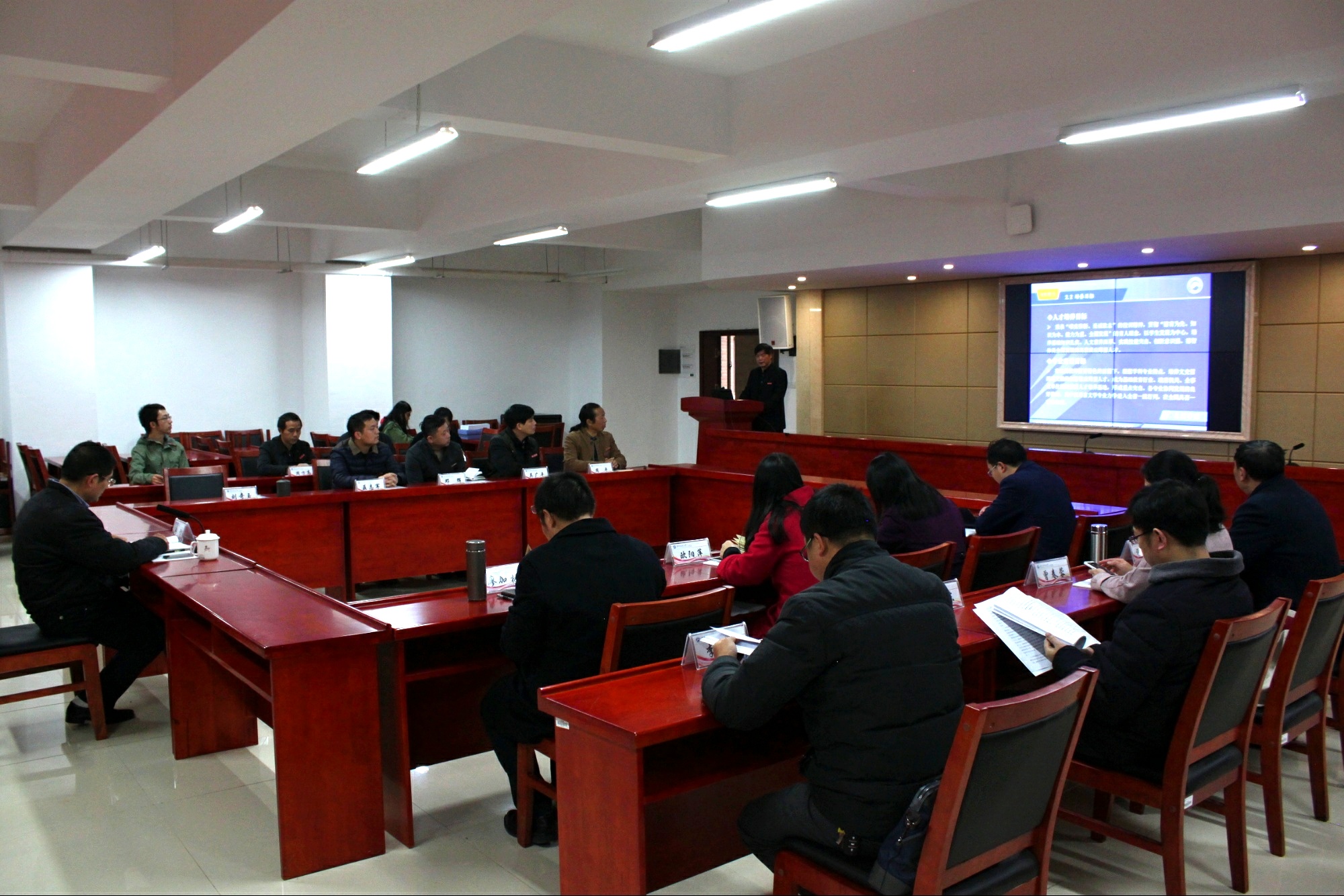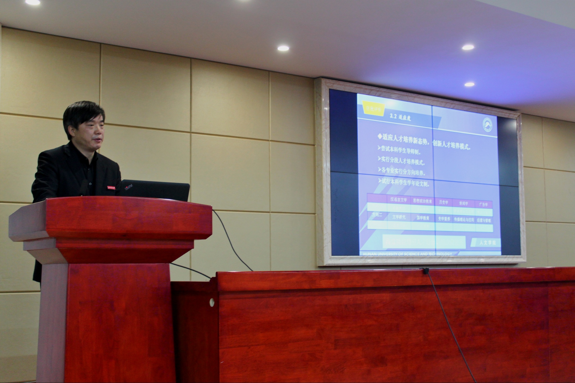 上午9时许,现场考察转移到立言楼B4-1报告厅,院长刘奇玉教授主持会议并做简要的汇报,院领导、相关系部负责人和教师代表近20人出席会议。刘院长首先简要阐述了KY.COM的办学历程以及办学现状,学院的师资队伍以及定位与目标,他指出我院的办学类型是教学研究型,办学层次是本科教育为主,发展目标是特色鲜明的高水平教学研究型学院。3211工程、豆沙包工作室、黑蚂蚁传媒工作室、语言艺术团、隐山哲学社等学院优秀项目是学院坚持“守正创新”办学宗旨的重要体现。