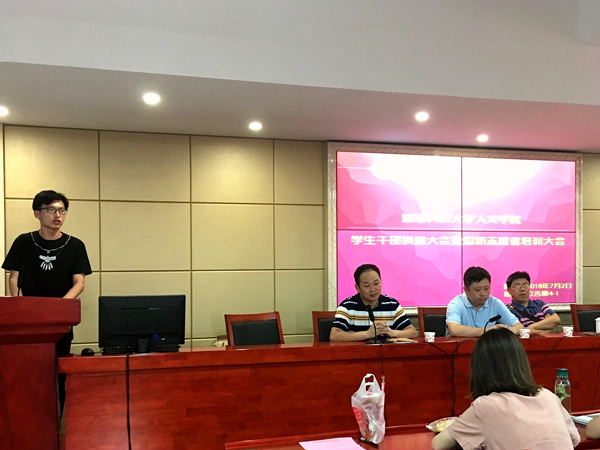 上任团委学生会主席李煜总结了上一年度团委学生会各项工作、活动的开展情况以及取得的成绩。他说我院上年度获得了优秀团委学生会称号,这得益于全体学生干部的努力。同时,他也指出团委学生会工作的一些不足。希望新任的学生干部去糟取精,把学院建设的更好。