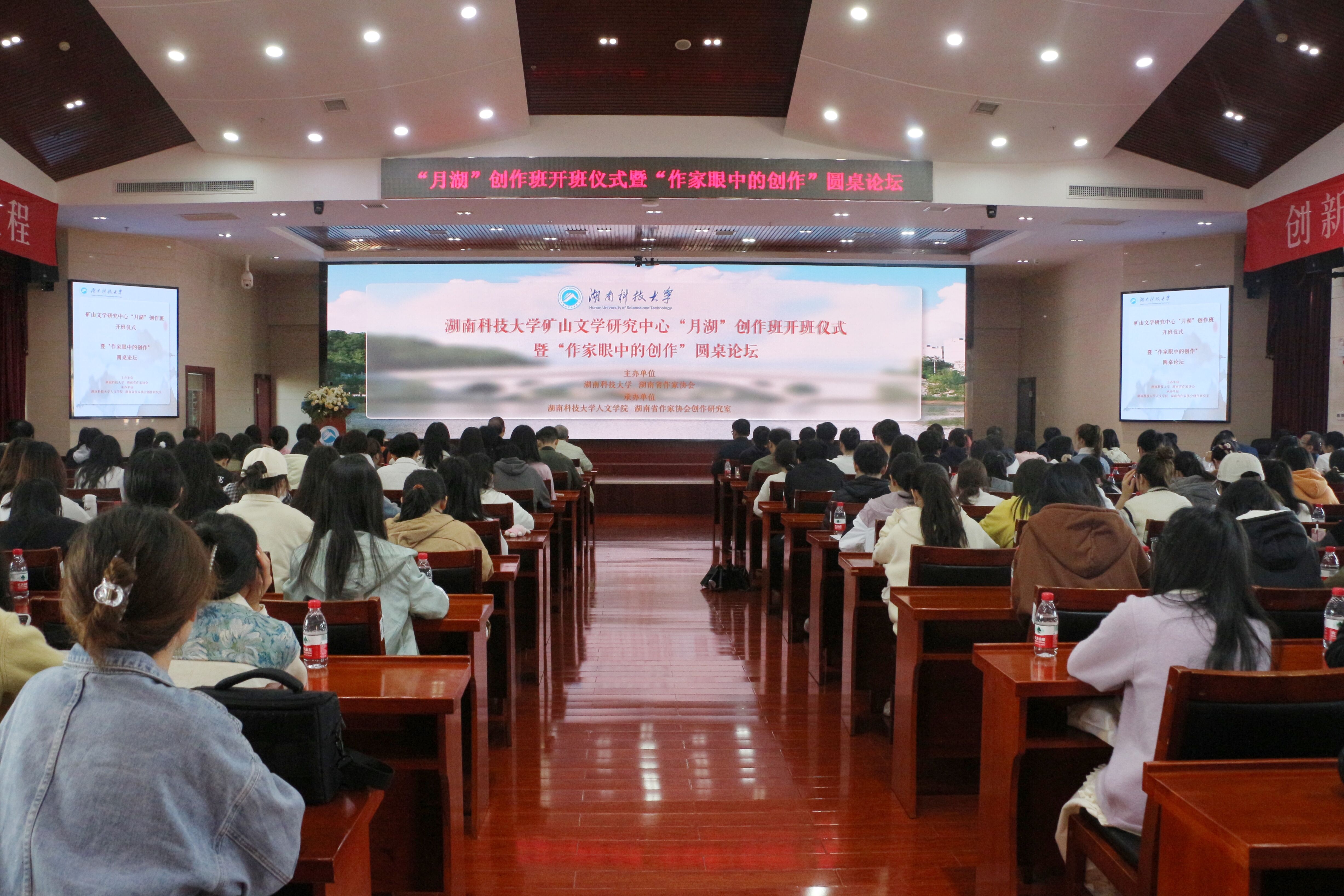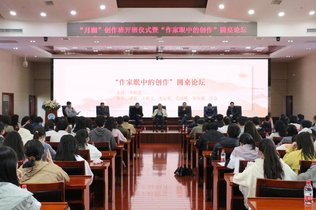 为创新人才培养模式,深化文学教育与创作交流,4月1日上午,我院于立德楼五楼报告厅举行矿山文学研究中心“月湖”创作班开班仪式暨“作家眼中的创作”圆桌论坛,中国作家协会名誉副主席谭谈,中国作家协会主席团委员王跃文,中国作家协会诗歌学会副会长梁尔源,湖南省作家协会名誉主席水运宪、梁瑞郴,湖南省作家协会副主席沈念,湖南省作家协会创作研究室主任贺秋菊,湖南省文字评论家协会副主席晏杰雄,我校矿山文学研究中心主任吴投文等诸多文坛大咖齐聚一堂,共同见证精彩时刻、分享创作心得。