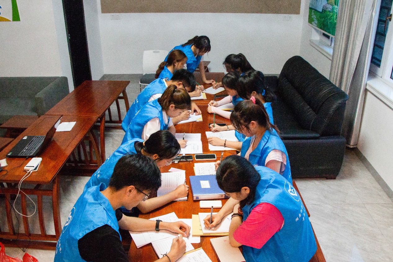 "嘀嘀、嘀嘀……",六点的闹铃一响,志愿者们迅速起床洗漱。早饭后,他们沿着两侧布满牵牛花、狗尾巴草的小道来到教学点。KY.COM团委书记曾思妍说:“在昨天了解当地留守儿童、教学环境等情况之后,我们便组织开会为各个班级分配了班主任及科任老师,要求各位志愿者提前备课,以确保今天的的教学顺利进行,让留守儿童感受来自青年志愿者们的温暖与关怀。”