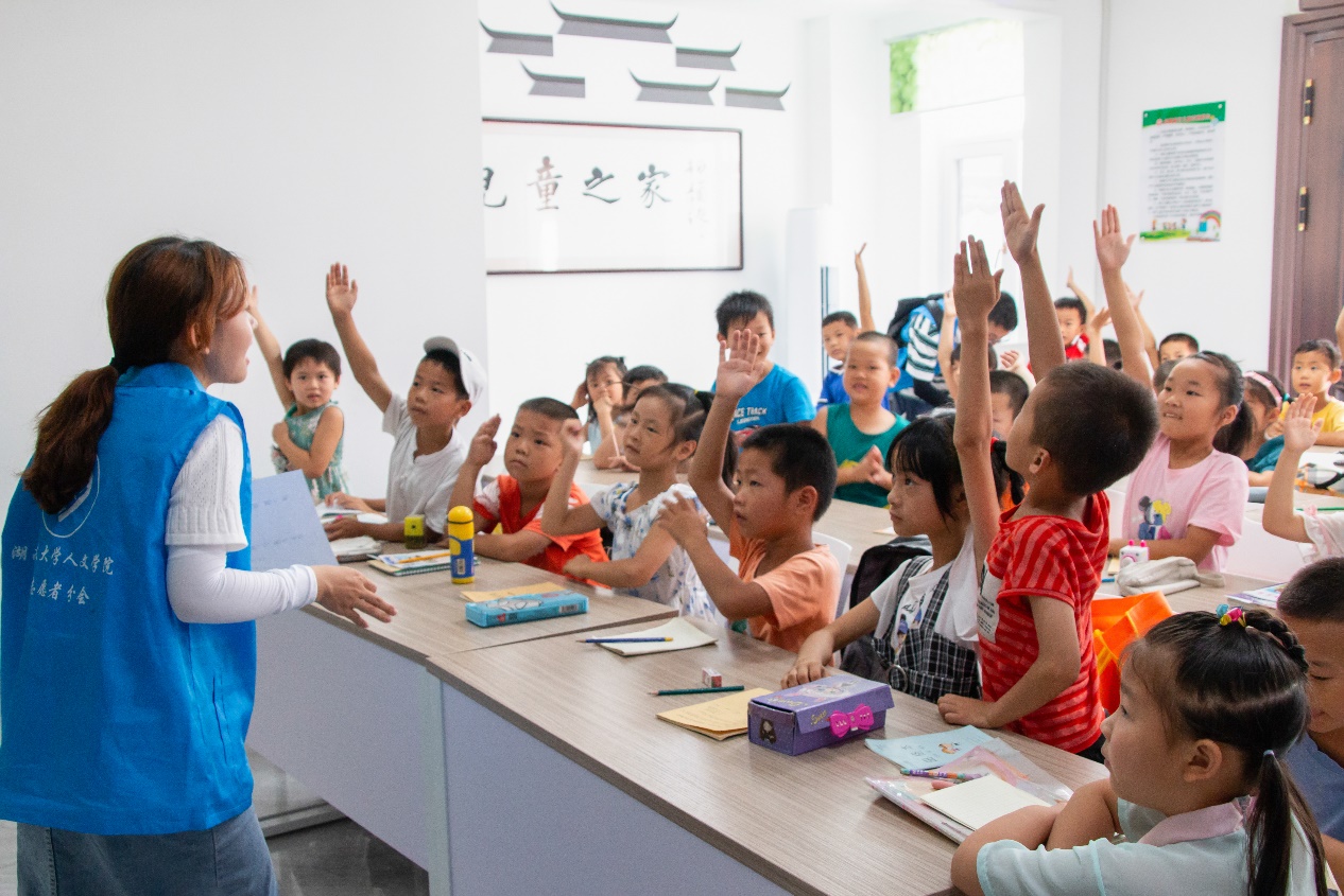 "同学们大家好,我是数学老师张一帆,很高兴在这个暑假与你们相遇。"上课哨声响起,支教老师们怀抱教案走进教室,同学们眼神里充满期待,脸上都洋溢着灿烂的笑容。