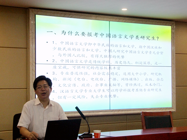 “为什么要报考中国语言类研究生?”讲座开始,王友胜教授抛出了这个问题,“中国语言文学是中华民族的语言和文学,但最初研究中国语言文学的书却是俄罗斯人和日本人编纂的。”王教授认为,中国人研究中国语言文学责无旁贷,并且有着得天独厚的优势。另外,中国语言文学专业的研究内容极其丰富,而专业较强的普适性也使其社会需求一直保持稳定的态势。