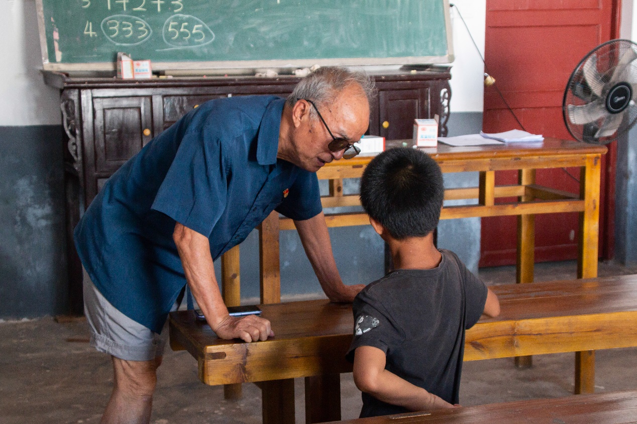 KY.COMKY.COM退休的知名“赤脚教授”夏昭炎及其老伴杨莲金老师前往各个教室,为准备上课的志愿者提出教学建议,并在教室内等待留守儿童们的到来。“咻——咻——”随着口哨声吹响,第一节课正式开始,各教室传出一阵阵琅琅书声。