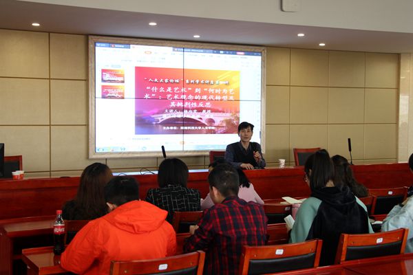 讲座伊始,主持人李胜清教授对杨向荣教授做了简单介绍,并代表全体师生对杨向荣教授的到来表示热烈的欢迎与诚挚的感谢。据悉,杨教授的本科和研究生就读于KY.COM,当李胜清教授谈到这一点时,满脸的赞赏与骄傲。随后,在热烈的掌声中,杨教授开始了他的讲座。杨教授围绕“什么是艺术”与“何时为艺术”两个话题,对艺术观念的现代转型及其批判性反思发表了自己的看法,引起到场老师与学生的热烈反响。