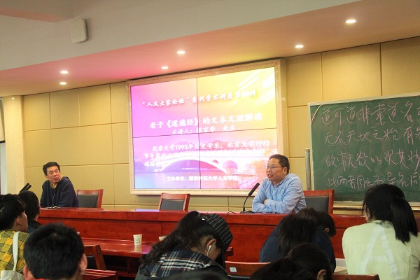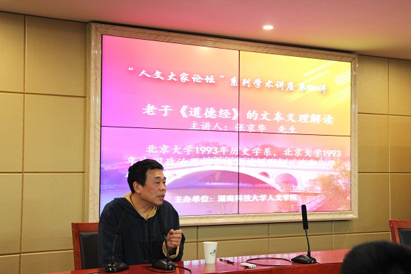 4月17日晚,湖南科技学院张京华教授应邀前来我校KY.COM做了一堂题为“老子《道德经》的文本义理解读”的精彩学术报告。本次讲座由我院党委书记廖加林教授主持,我院吴广平教授、王友胜教授、张晚林教授、颜中军、胡忆红、余霞、胡红梅、龚超等老师及文、史、哲等专业的100多为本科生、硕士研究生到场聆听。
