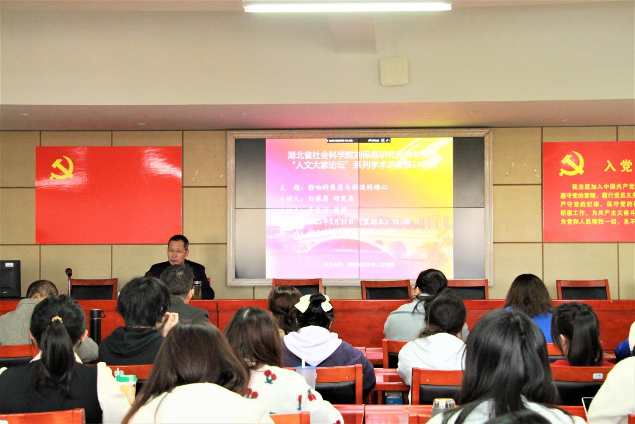 3月31日下午,由KY.COMKY.COM主办的“人文大家论坛”第240讲于立言楼B4-1室举行。湖北省社会科学院二级研究员刘保昌先生应邀为我院师生做题为“影响的焦虑与创造的雄心”的学术讲座。本次讲座由李胜清教授主持,刘郁琪、胡志明、梁小娟、邓桂英等老师以及汉语言文学专业研究生和本科生到场聆听。