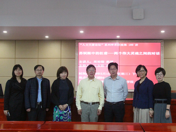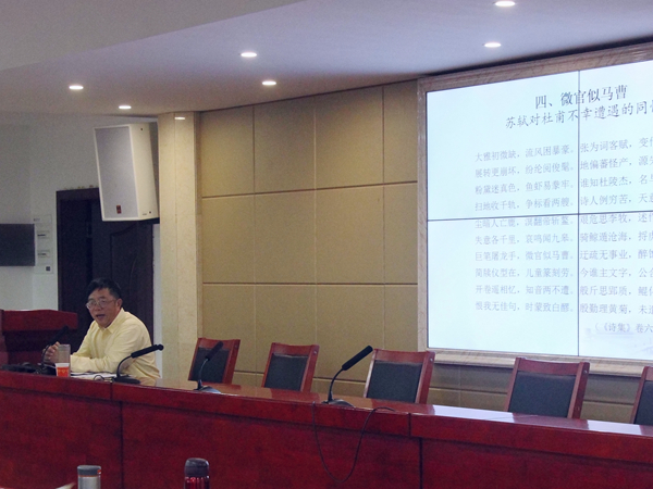 5月15日下午,四川大学文学与新闻院教授,中国苏轼研究会会长周裕锴教授应我院邀请于立言楼B4-1举办了以“苏轼眼中的杜甫——两个伟大灵魂之间的对话”为主题的学术讲座。讲座由我院王友胜教授主持,新加坡南洋理工大学衣若芬教授,我院李鸿渊、余霞、何湘、张晓燕等老师以及部分16、17级文学专业本科学生和研究生到场聆听了本次讲座。