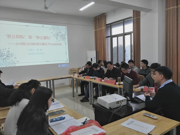 本次沙龙由颜中军副教授主持,毛小平教授、张晚林教授、温航亮博士、汪隐峰博士担任点评嘉宾,报告人周锋、李秀倜、何海乐、林建辉、毛文杰、罗蔚同学进行论文报告。周锋同学认为古代先贤通常提倡“崇公抑私”,这样会造成公私两无的局面,而如今社会转型,在市场化、全球化浪潮的推动下,我们应该更加“崇公重私”;李秀倜同学见解新颖独到,提出儒家学说重视中庸之道,并没有特别明确“公私”与“义利”孰轻孰重,只是在一些特定前提下先后不同;何海乐同学说道,古时的大公是为君主谋大私,而现在的经济发展则需要大家树立正确公私观,认识到私欲客观合理,这样才能更好地实现人的自由全面发展;林建辉同学认为,从毛泽东思想到如今的中国特色社会主义发展道路,时代不断发展,社会不断转型,“公私”的定义改变,必然会使人的内涵也受到影响;毛文杰同学从美国的公共精神和个人利益的角度出发,映射到中国社会,启示我国应该重视公共事务,政府也应着力培养公共精神;罗蔚同学认为,“公”与“私”既属于道德范畴也属于社会范畴,随着经济社会的转型,我们的观念应该从古代的“重公抑私”逐渐发展为保护个人政治、经济权利,但与此同时,对拜金主义和贪污腐败现象也应严治不怠。老师们对每位同学的发言提出了一系些学术问题和撰写方面的建议,希望大家能更深入地钻研学术,积极进行研究讨论,注重学习过程和培养环节,多进行交流学习。同学们也对老师的建议做出回应,在老师的指导下,对自己的报告有了更深刻的理解。